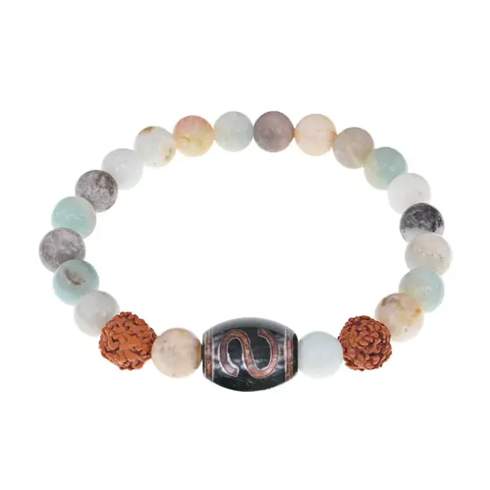 Стрейч-браслет с бусинами из натуральной рудракши, синтетического амазонита и тибетской бусиной Дзи из агата с символом «Денежный крючок».