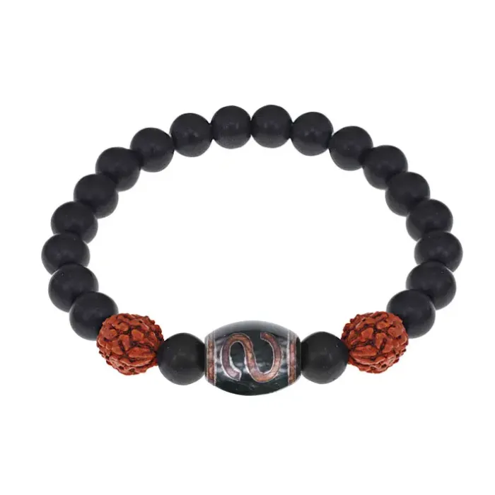 Браслет с Дзи Денежный крючок, нат. рудракшей и синт. камнем Шунгит BSDR-06-24