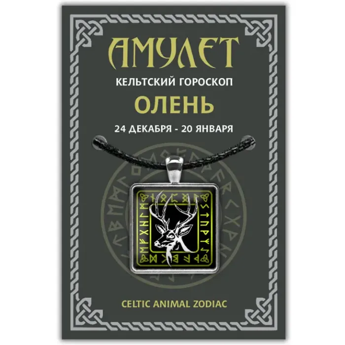 Амулет Кельтского гороскопа с изображением Оленя — это защитный символ для людей, родившихся с 24 декабря по 20 января. Этот квадратный амулет размером 37х29 мм выполнен из бижутерного сплава с покрытием под серебро и защищён выпуклой стеклянной линзой. Размер изображения составляет 25х25 мм, что делает его ярким и заметным аксессуаром. В комплекте предоставляется шнурок с застёжкой и вкладыш с кратким описанием, а также упаковка в полипропиленовый пакет.