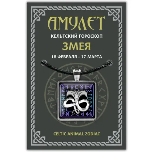 Кельтский амулет, символизирующий защиту и удачу для людей, родившихся с 18 февраля по 17 марта под знаком Змеи. Этот квадратный амулет с изображением, защищённым выпуклой стеклянной линзой, изготовлен из бижутерного сплава с покрытием под серебро. Размеры изделия составляют 37х29 мм, а изображение — 25х25 мм. Амулет упакован в полипропиленовый пакет и комплектуется шнурком с застёжкой и вкладышем с кратким описанием. Традиционно такие амулеты ценятся за их способность приносить удачу и защищать от негативных влияний.