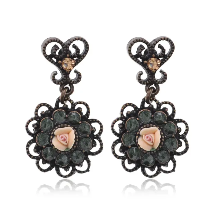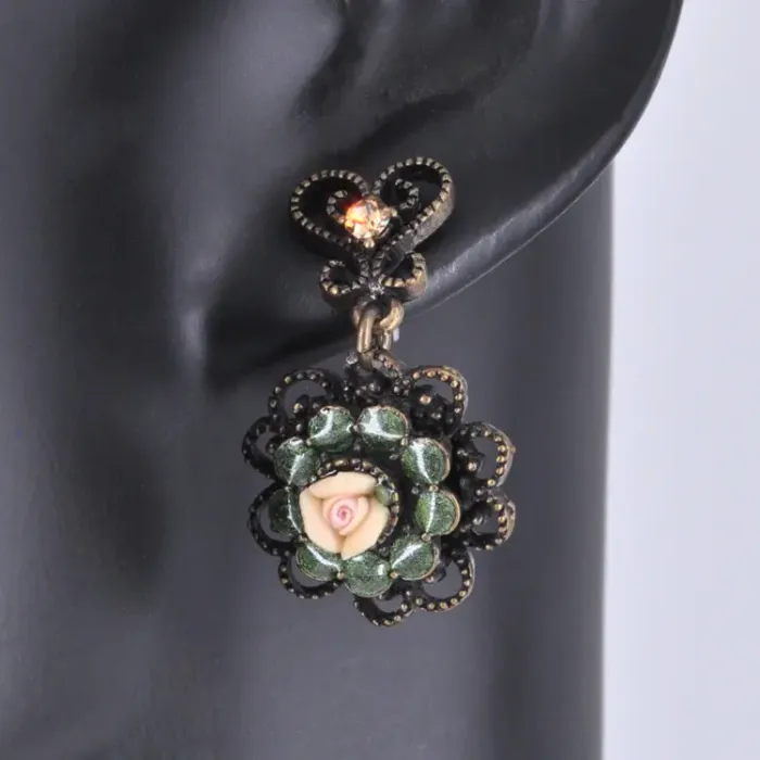 Материал и изготовление: Металл с покрытием под бронзу и эмалью, вставки из пластика и стразов. Тип замка — пусет (гвоздик).