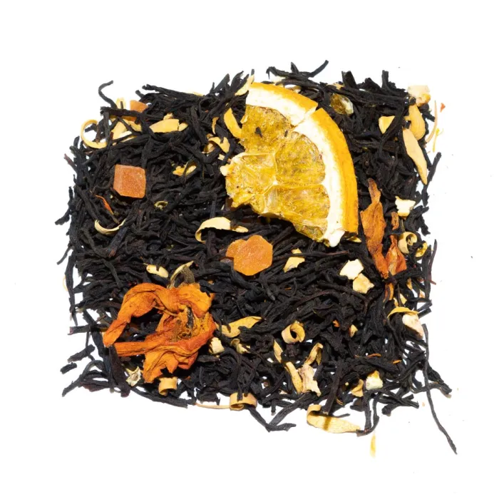 Состав: Чёрный чай, цукаты, цедра апельсина, дольки апельсина, цветки апельсинового дерева, цветки лилии, лепестки сафлора, ароматизатор.