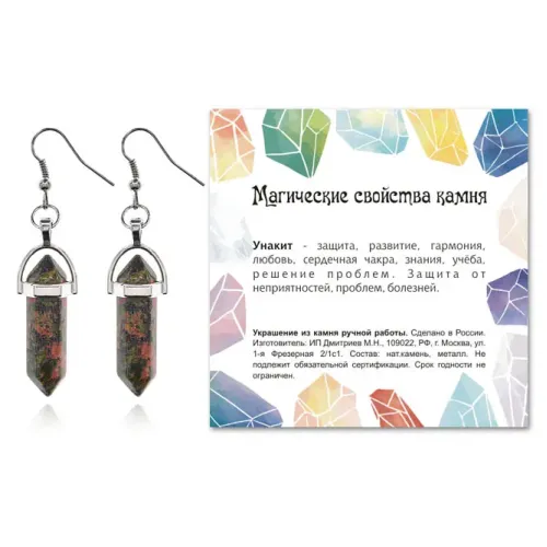 4. Каждая пара упакована в прозрачный пакет с подвесом и комплектуется вкладышем с описанием значения камня Унакит — это отличный подарок для ценителей минералов.