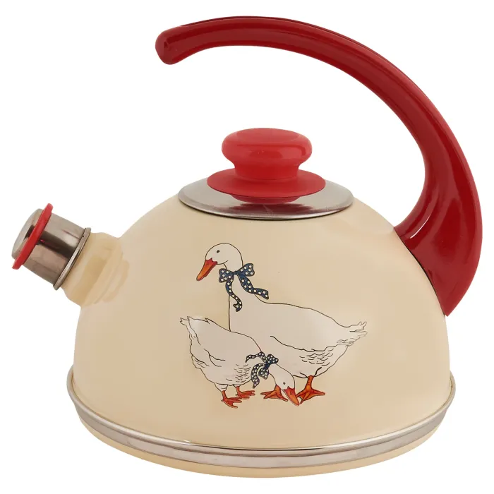Изделие подходит для использования на всех типах плит (уточняйте совместимость с индукцией). Эмалированная поверхность устойчива к загрязнениям и сохраняет внешний вид. Чайник в классическом стиле с рисунком «гуси» на фоне цвета слоновой кости сочетается с посудой в традиционном или деревенском интерьере.
