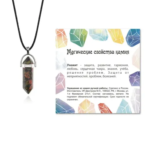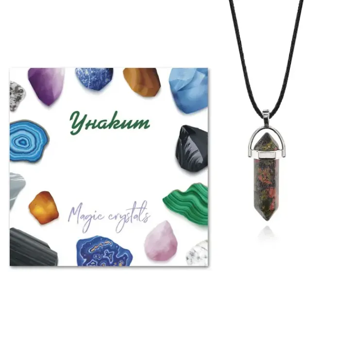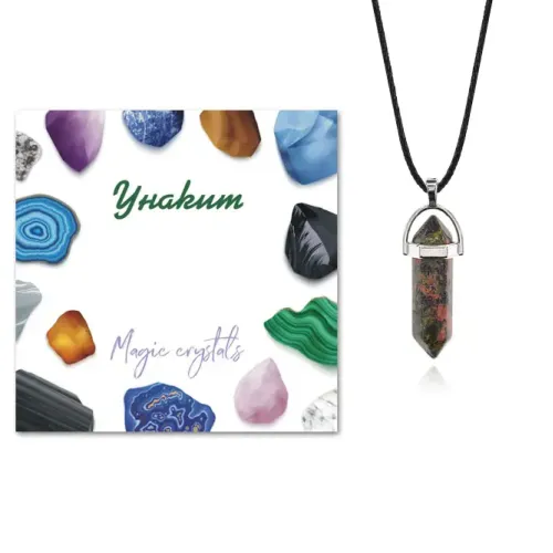 Кулон из натурального камня Унакит — это не только стильное украшение, но и символ гармонии и любви. Длина кулона составляет 40 мм, а фурнитура выполнена из бижутерного сплава с покрытием под серебро, что придаёт изделию элегантный вид.