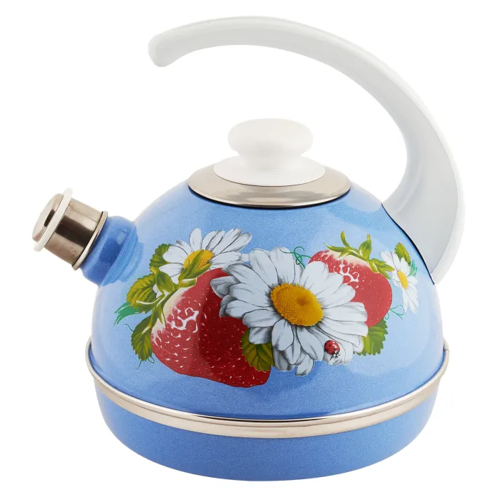 Эмалированный чайник объёмом 3.5 литра предназначен для кипячения воды на плите. Модель отличается наличием сигнального свистка и декоративным рисунком «Синий туман с ромашками».