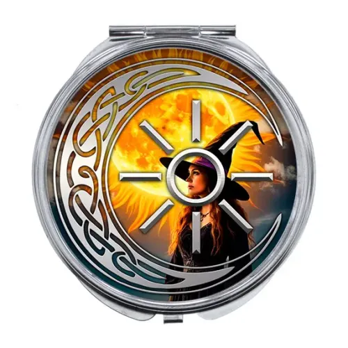 Складное зеркало из металла и стекла с изображением солнечной руны.