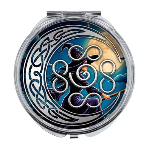 Складное зеркало для личного использования, изготовленное из металла и стекла, с изображением руны.