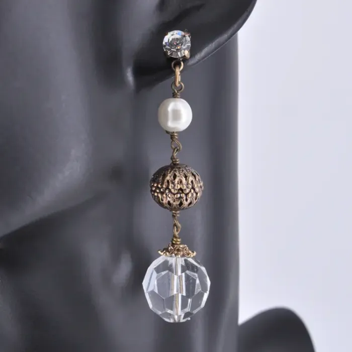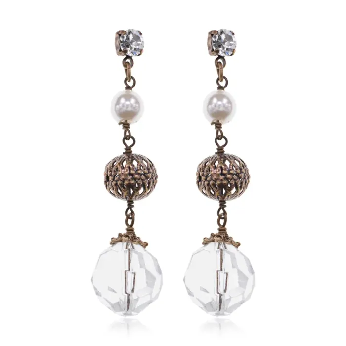 Серьги-пусеты из металла с покрытием под бронзу и медь, декорированные искусственным жемчугом, кристаллами и стеклом.