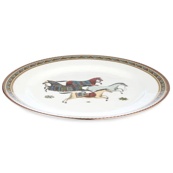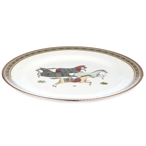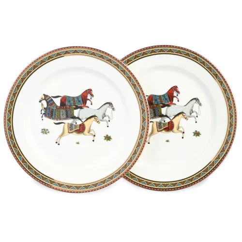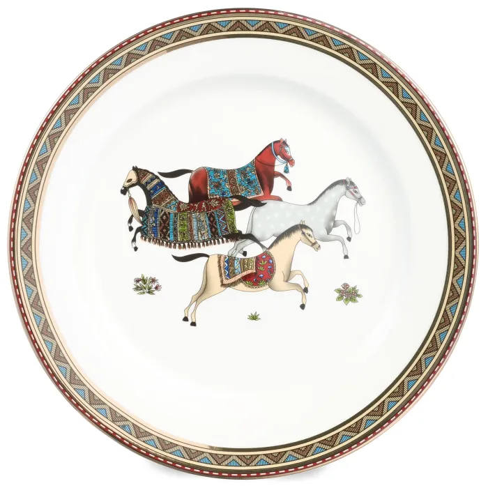 Тарелки выполнены из тонкостенного упрочненного фарфора, что обеспечивает прочность и долговечность. Прямые формы изделий дополнены декоративным орнаментом с изображением движения лошадей и золотой окантовкой. Посуда сертифицирована для контакта с пищевыми продуктами.