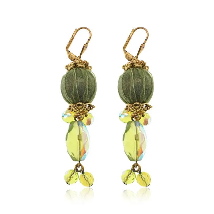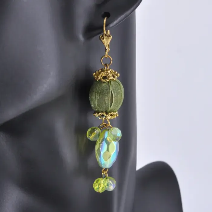 Серьги для ношения, выполненные из металла с покрытием под золото и вставками из стекла и текстиля в зеленом цвете.