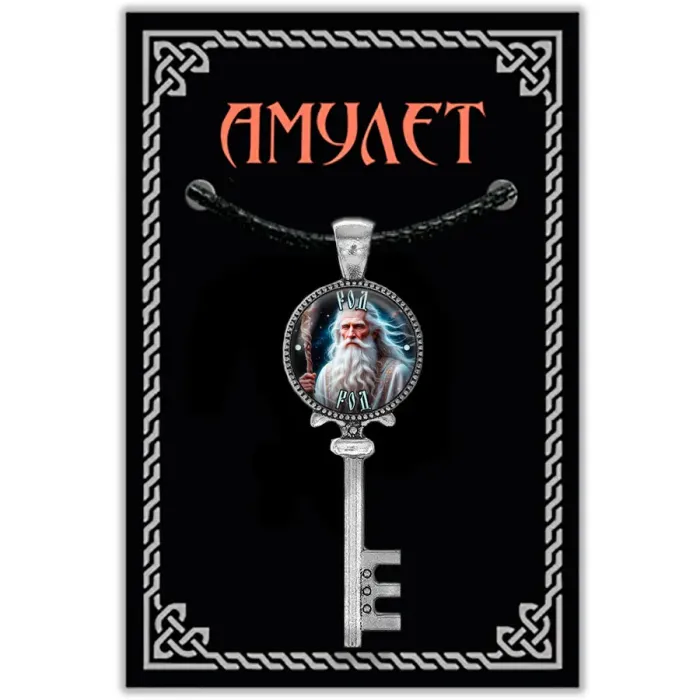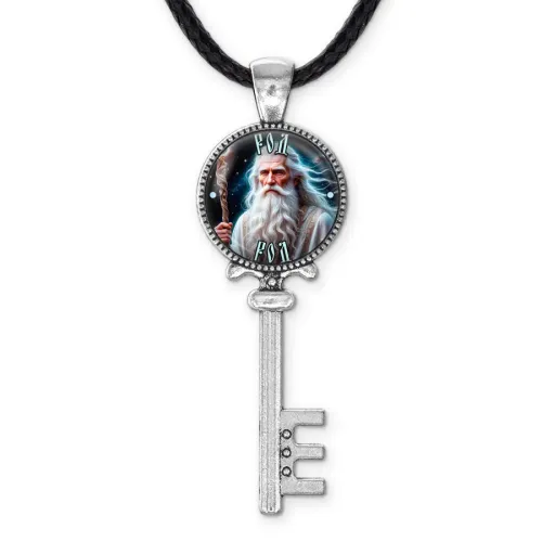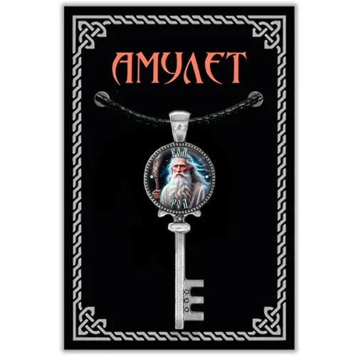 Кулон-амулет из бижутерного сплава под серебро с изображением славянского божества Род, защищённым выпуклой стеклянной линзой.