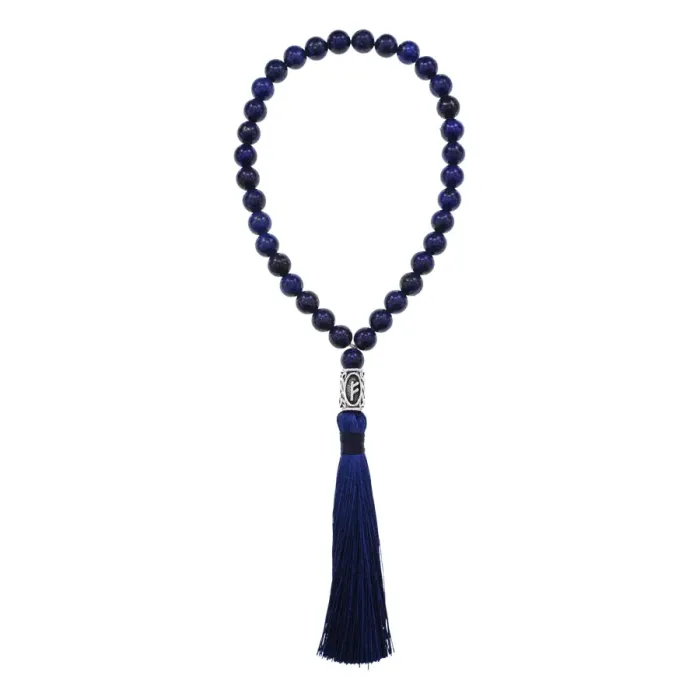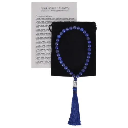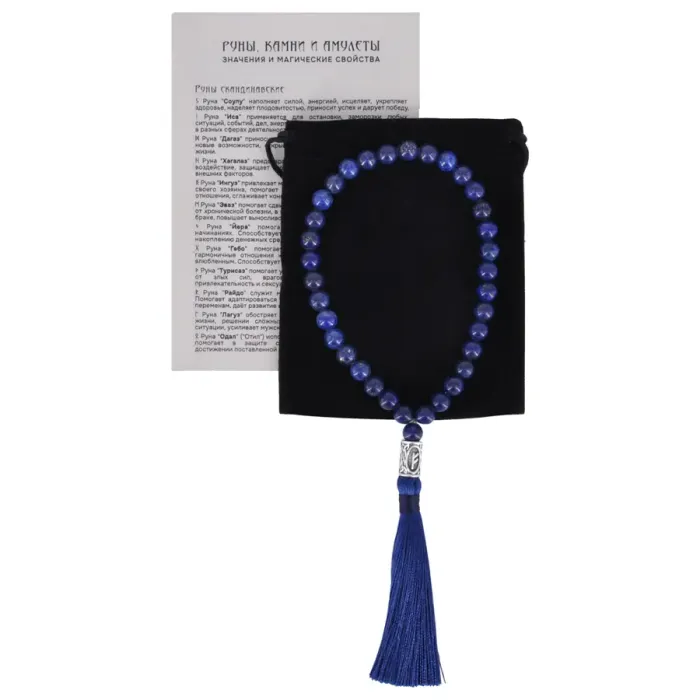 Рунические чётки с бусинами из натурального лазурита и руной Феху.