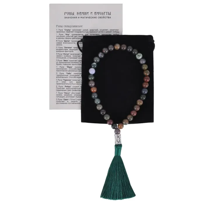 Размеры и комплектация: Высота чёток ~22.5 см, диаметр бусин 8 мм, размер рунической бусины 12.5х7.5 мм.