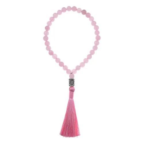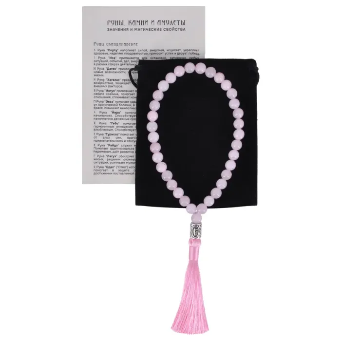 Сувенирные чётки ручной работы с бусинами из натурального розового кварца и рунической подвеской.