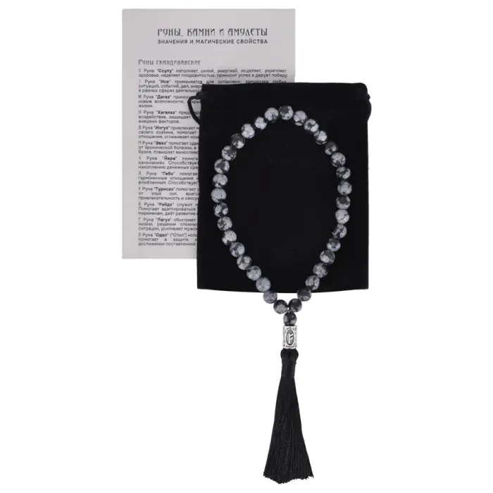 Рунические чётки с бусинами из натурального снежного обсидиана и отдельной рунической бусиной.