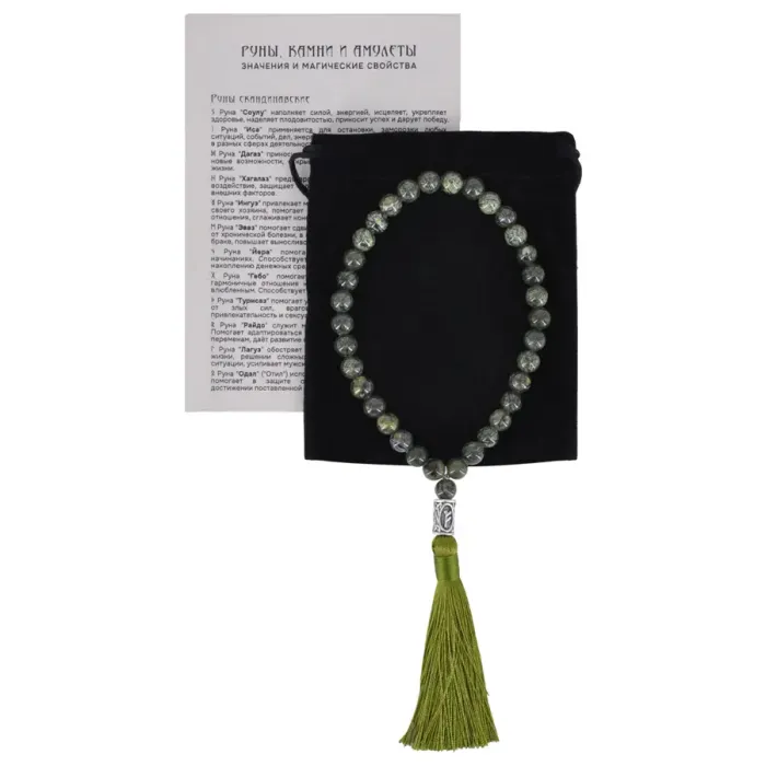 Размеры и комплектация: Высота чёток ~22.5 см, диаметр бусин 8 мм, размер рунической бусины 12.5х7.5 мм.