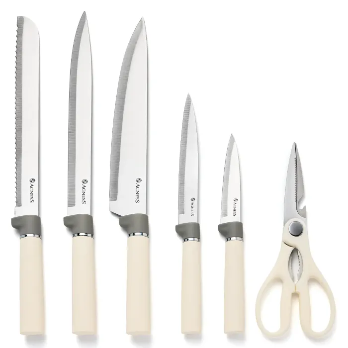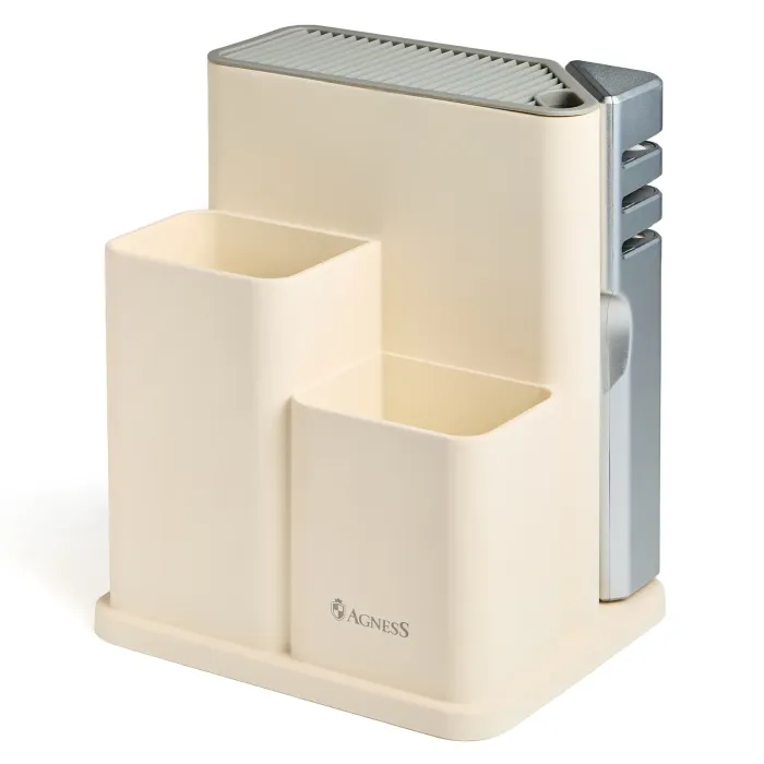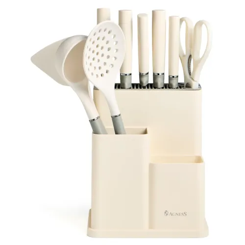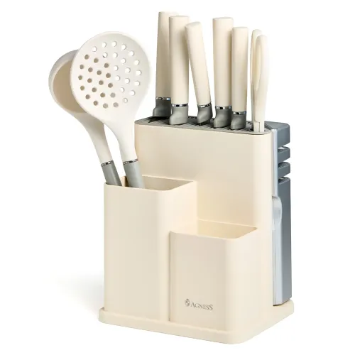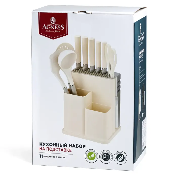 Набор из 11 предметов Agness представляет собой комплект основных кухонных ножей и аксессуаров для приготовления пищи. В набор входят пять ножей различного назначения, а также половник, лопатка, шумовка, подставка, ножеточка и ножницы.