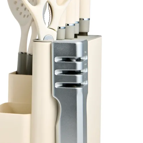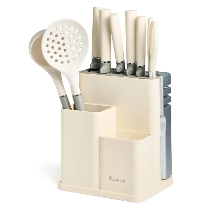 Набор из 11 предметов: 5 ножей, половник, лопатка, шумовка, подставка, ножеточка, ножницы, цвет: белый/серый - Agness
