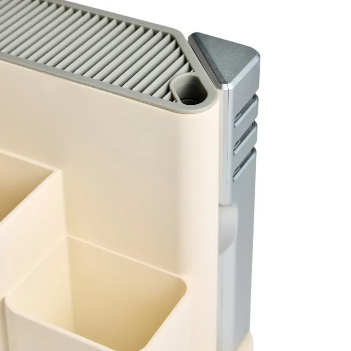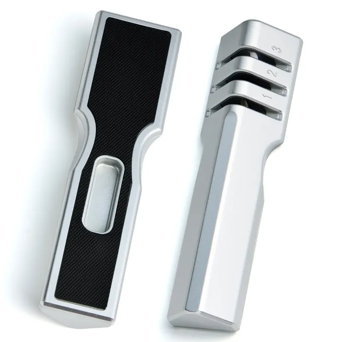 Лезвия ножей изготовлены из коррозионностойкой стали, что обеспечивает долговечность и простоту ухода. Ручки инструментов выполнены из пластика. Подставка предназначена для компактного хранения всего комплекта. Ножеточка оснащена тремя уровнями заточки для поддержания остроты лезвий.