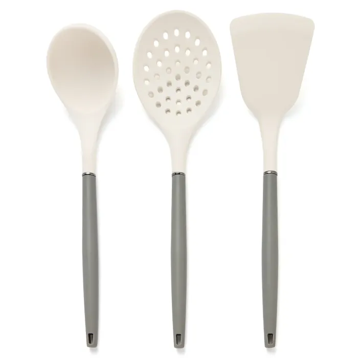 Для сохранения внешнего вида и свойств материалов рекомендуется мыть предметы вручную. Комплект в бело-серой цветовой гамме подходит для кухонь в современных стилях.