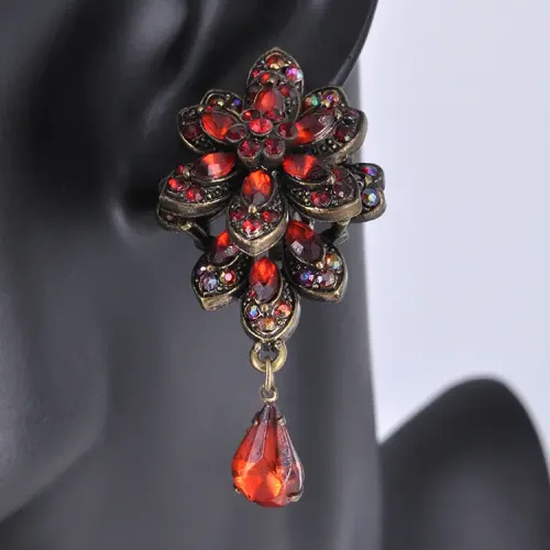 Серьги-клипсы в виде цветка георгина. Изготовлены из металла с покрытием под бронзу, декорированы кристаллами и стразами.