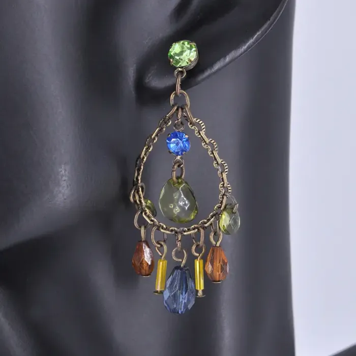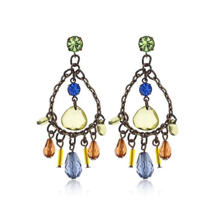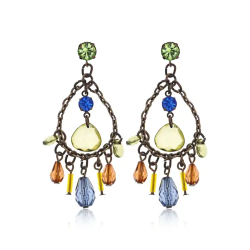 Серьги-пусеты из металла с покрытием под бронзу и вставками из кристаллов и стекла в форме капли.