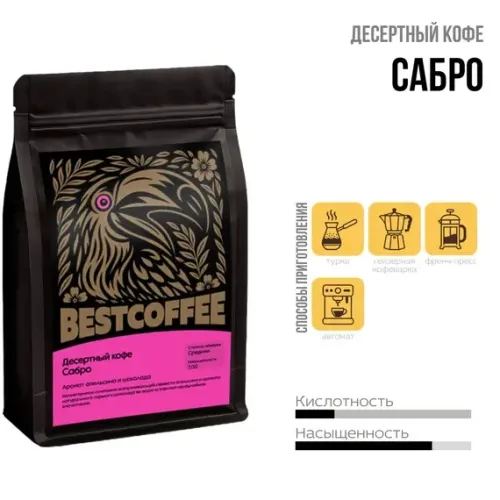 Десертный кофе Сабро — это арабика с высокогорных плантаций, обжаренная до средней степени. Его профиль построен на гармоничном сочетании освежающих нот спелого апельсина и глубокого, бархатистого вкуса горького шоколада, что оставляет лёгкое, сбалансированное послевкусие.