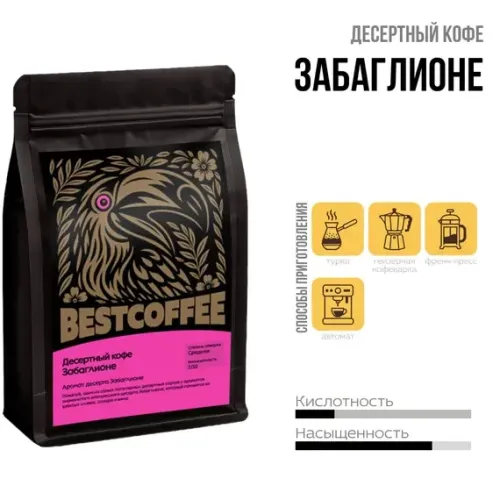 Кофе в зернах «Забаглионе» — десертный купаж на основе арабики, вдохновлённый ароматом итальянского десерта. Средняя обжарка раскрывает нежные кремовые оттенки с тонкими винными акцентами, создавая сбалансированный напиток с мягким послевкусием.