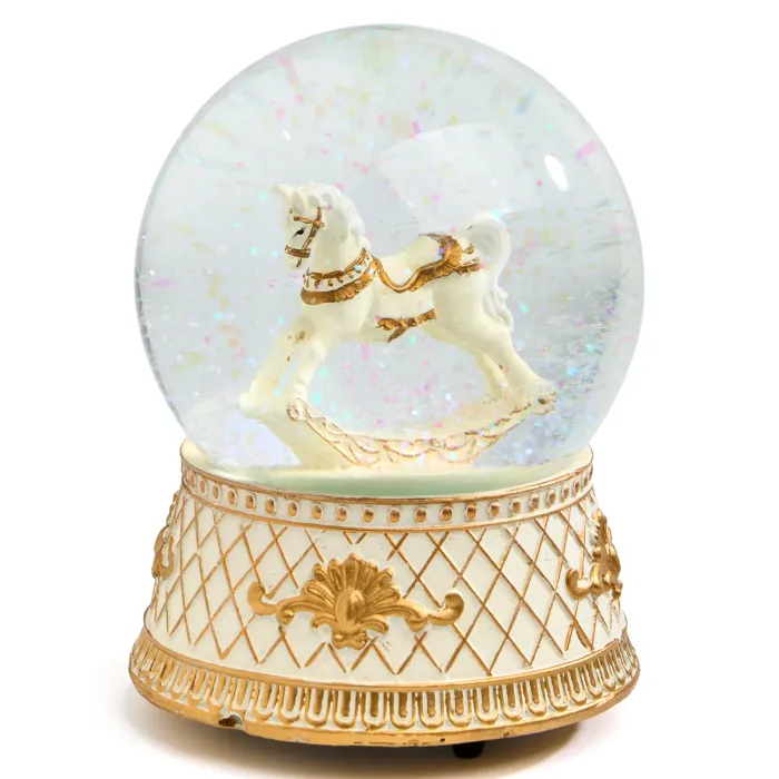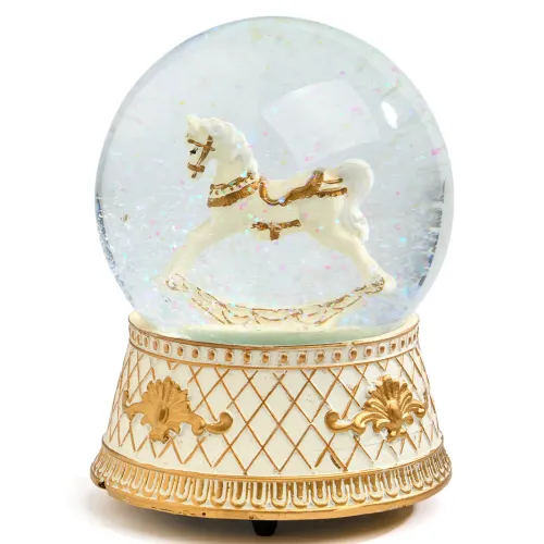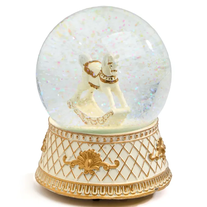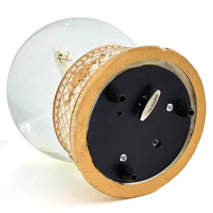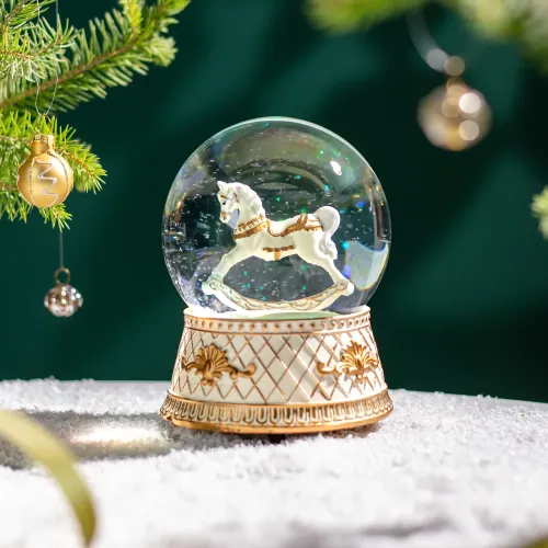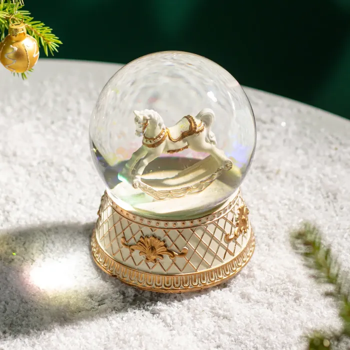 Музыкальная статуэтка снежный шар от Lefard — это декоративный элемент, изготовленный из полистоуна. Внутри прозрачной сферы размещена фигурка конька с золотыми акцентами, окружённая мерцающим снегом.