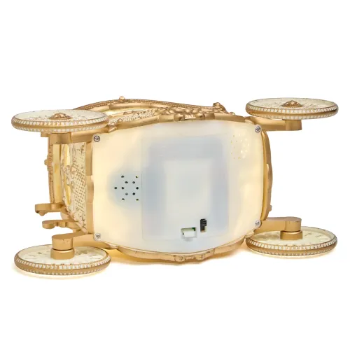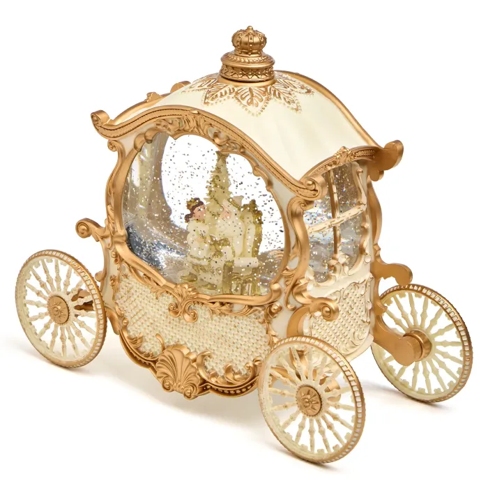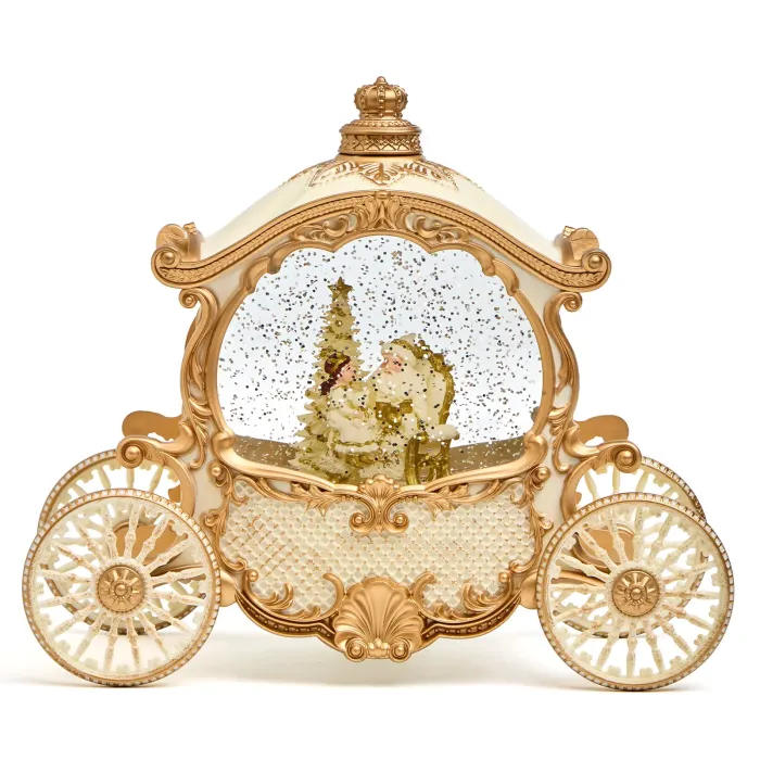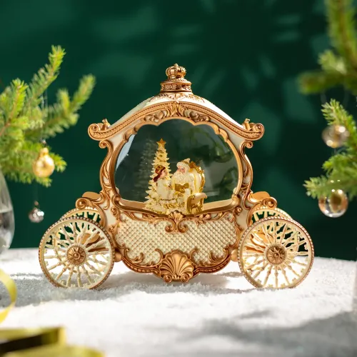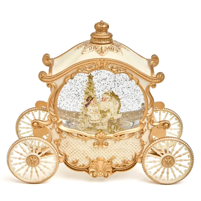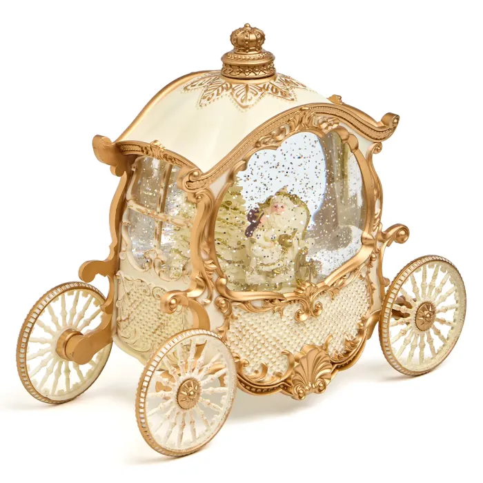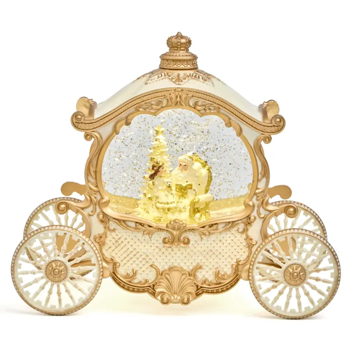 Каретка оснащена LED-подсветкой, которая мягко освещает миниатюрную зимнюю сцену внутри прозрачного купола. Музыкальный механизм добавляет мелодичное сопровождение, создавая уютную атмосферу. Детализированный дизайн включает резные элементы и кружевные колёса, что делает её привлекательной деталью интерьера.