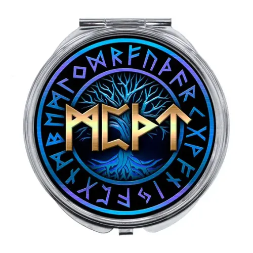 Складное зеркало для сувенирных целей. Изготовлено из металла и стекла, украшено изображением печати.