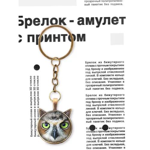 Брелок Сова — это стильный аксессуар, который станет отличным дополнением к ключам или сумке. Изготовленный из бижутерного сплава с прочным покрытием под бронзу, он сочетает в себе элегантность и долговечность. Изображение совы под выпуклой стеклянной линзой придаёт изделию уникальность и характер. В комплект входит кольцо для ключей, что делает его удобным в использовании. Упакован в прозрачный полипропиленовый пакетик, брелок идеально подходит для подарка или личного использования.