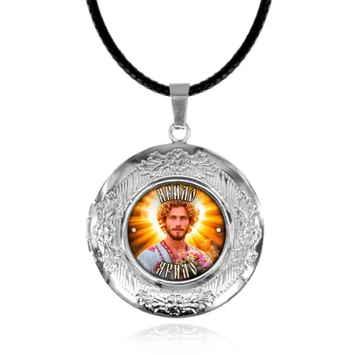 Арома-амулет «Славянские боги Ярило» — это уникальное украшение, выполненное из бижутерного сплава с покрытием под серебро. Диаметр кулона составляет 36х33 мм, а изображение помещено под выпуклой стеклянной линзой диаметром 20 мм, что придаёт ему особую выразительность. В комплект входят полипропиленовый пакет, подложка, этикетка и шнурок с застёжкой, а также впитывающий шарик для аромата.