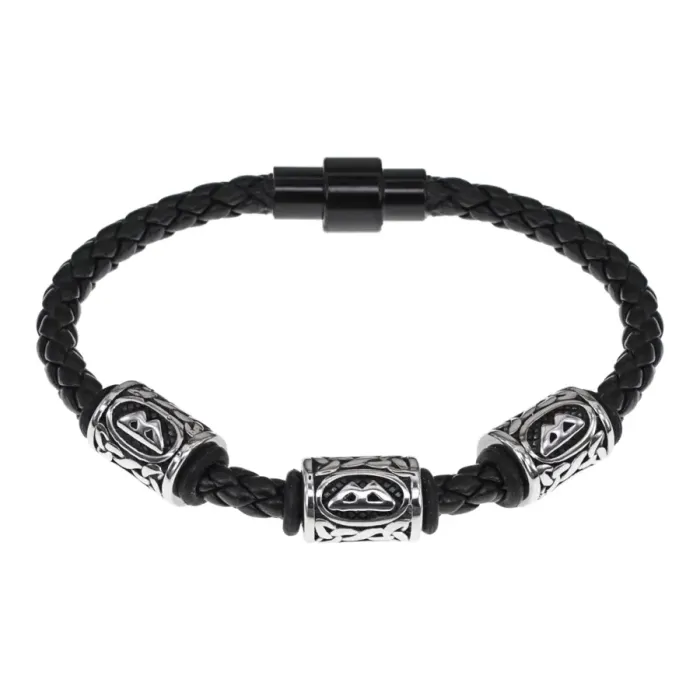 Браслет из натуральной кожи с бусинами из нержавеющей стали и рунической формулой.
