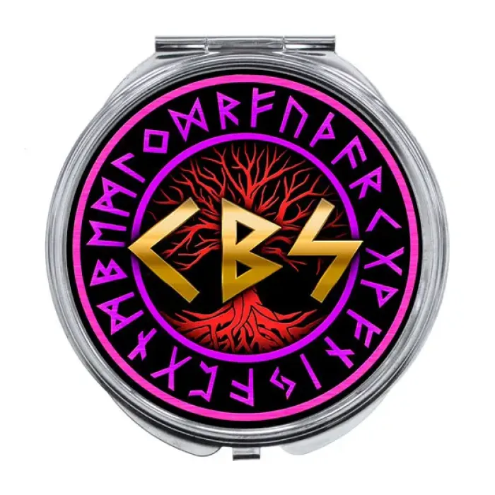 Складное зеркало для личного использования, изготовленное из металла и стекла, украшено символами рун.