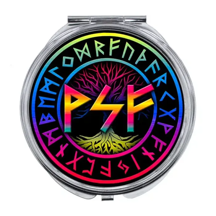 Складное зеркало из металла и стекла с изображением рунической формулы.