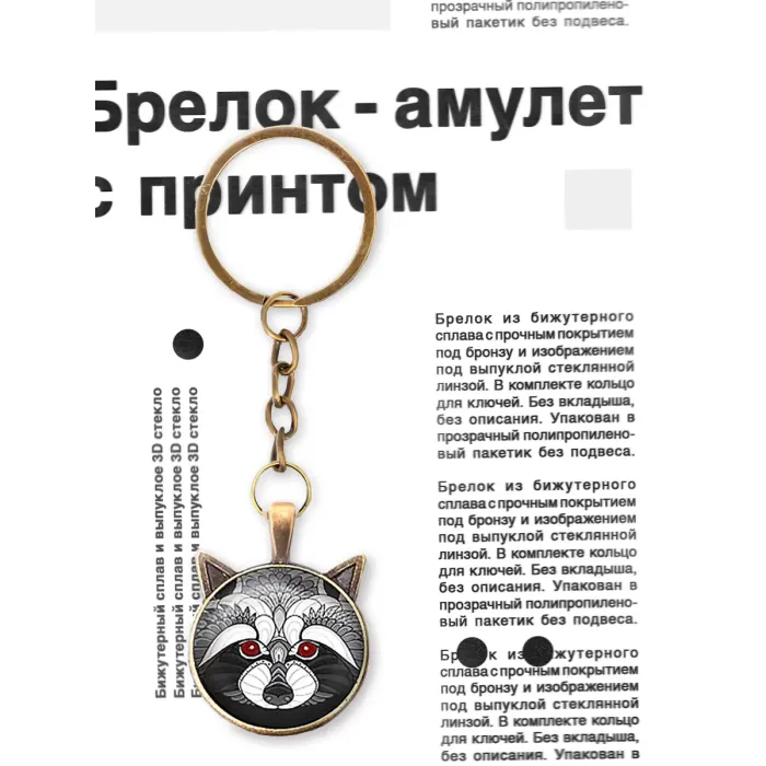 Брелок Енот — это стильный аксессуар, который добавит индивидуальности любому набору ключей. Изготовленный из бижутерного сплава с прочным покрытием под бронзу, он сочетает в себе элегантность и долговечность. Изображение енота защищено выпуклой стеклянной линзой, что придаёт ему особую выразительность.