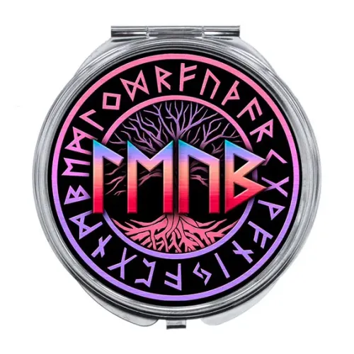 Складное зеркало для сувенирных целей, изготовленное из металла и стекла, с нанесённым изображением.