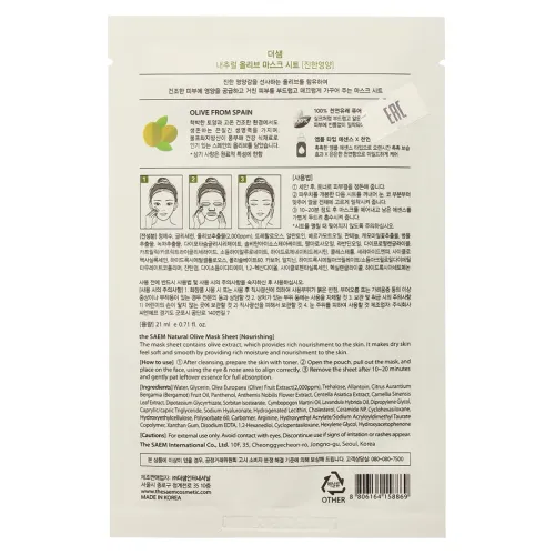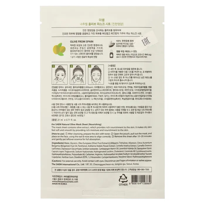 Тканевая маска для лица Natural Olive Mask Sheet от The Saem — это эффективное средство для увлажнения и питания кожи. Маска содержит экстракт оливы, который помогает поддерживать оптимальный уровень влаги в коже, а также минеральную воду, насыщенную полезными микроэлементами и солями. Благодаря кислороду в составе, кожа получает дополнительное питание и становится более здоровой.
