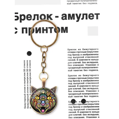 Брелок Кошка — это стильный аксессуар, который добавит изюминку в повседневную жизнь. Изготовленный из бижутерного сплава с прочным покрытием под бронзу, он не только красив, но и долговечен. Изображение под выпуклой стеклянной линзой придаёт брелку особый шарм и элегантность.