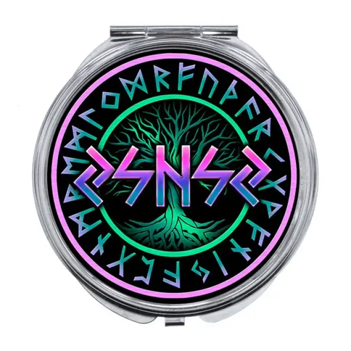 Складное зеркало из металла и стекла с нанесённым изображением печати.