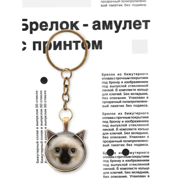 Брелок Тайская кошечка — это стильный аксессуар, который добавит изюминку в повседневную жизнь. Изготовленный из бижутерного сплава с прочным покрытием под бронзу, он не только красив, но и долговечен. Изображение под выпуклой стеклянной линзой придаёт ему уникальность и шарм. В комплекте предусмотрено кольцо для ключей, что делает его практичным выбором для хранения ключей или как элемент декора на сумке. Упаковка в прозрачный полипропиленовый пакетик обеспечивает защиту товара и удобство при транспортировке.