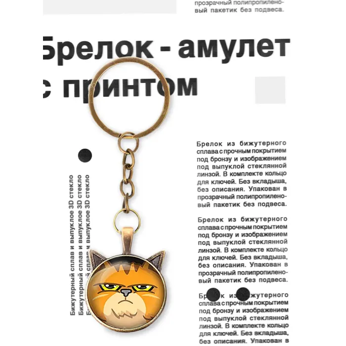 Брелок "Недовольный кот" — это оригинальный аксессуар, который добавит немного юмора в повседневную жизнь. Изготовленный из бижутерного сплава с прочным покрытием под бронзу, он не только стильный, но и долговечный. Изображение под выпуклой стеклянной линзой придаёт брелку уникальность и выразительность.