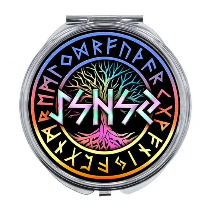 Складное зеркало для сувенирных и ритуальных целей, изготовленное из металла и стекла, с нанесёнными руническими символами.