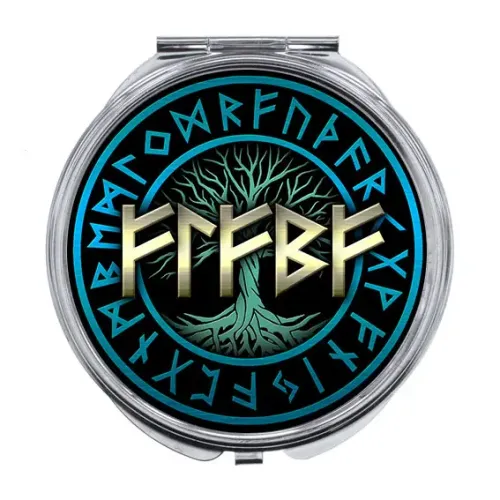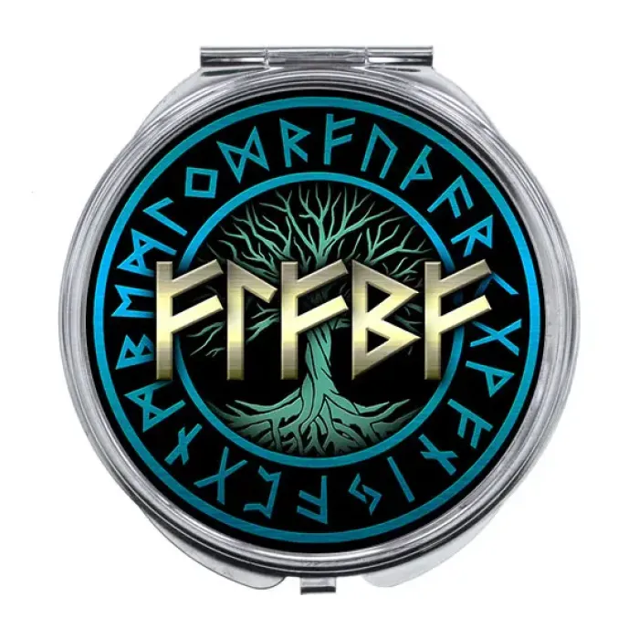 Складное зеркало для сувенира или личного использования, выполнено из металла и стекла. На зеркало нанесено изображение с символикой.