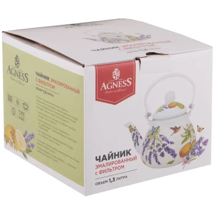 Эмалированный чайник Agness серии «Прованс Лимоны» предназначен для кипячения воды и заваривания чая. Модель объёмом 1.3 литра изготовлена из эмалированной стали и оснащена съёмным фильтром.