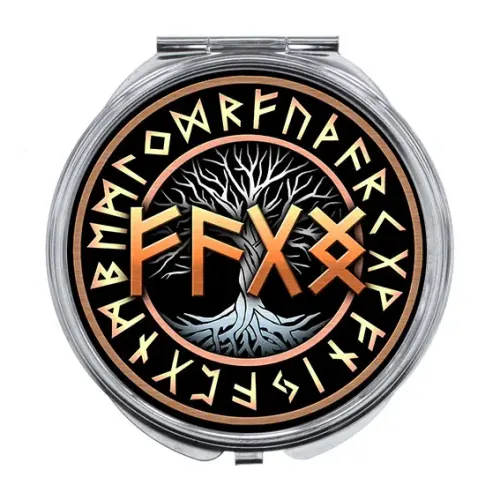 Складное зеркало для личного использования, изготовленное из металла и стекла. На поверхность нанесено изображение с символикой рун.