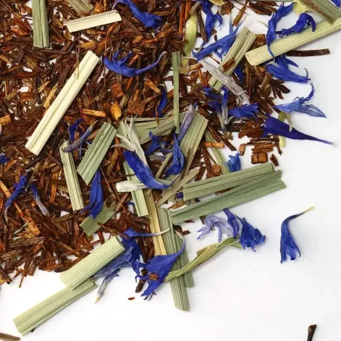 — Внешний вид сырья: смесь ройбуша с кусочками лимонной травы и лепестками василька;