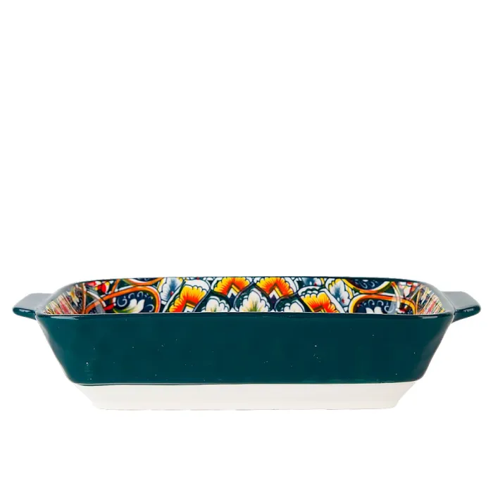 Блюдо изготовлено из фарфора, что обеспечивает прочность и термостойкость. Глянцевая поверхность достигается за счёт нанесения слоя глазури. Прямоугольная форма с невысокими бортиками удобна для запекания порционных блюд и их подачи.